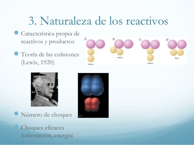 En el nivel molecular, las velocidades de reacción dependen de las colisiones entre moléculas. Naturaleza de los reactivos como influyen las propiedades de los reactivos en la velocidad de la reacción. Se propone una liga en la que explica con otro ejemplo, cómo afecta la velocidad de reacción la naturaleza de los reactivos, en él se indica que cuando ambos reactivos son líquidos es más rápida la transformación y una forma de revisarlo es con la formación de un precipitado. Naturaleza de los reactivos las reacciones químicas se ven favorecidas cuando: